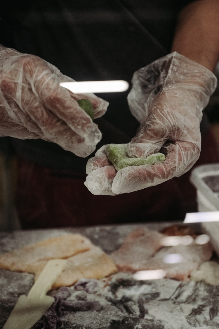 プレミアム桔梗信玄餅アイス用の餅の製造は 原料の計量、撹拌、餅を練る時間、温度等・・・
